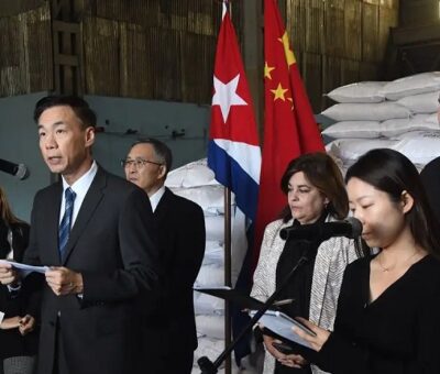 Ver más.El embajador de China en Cuba, Hua Xin, pronuncia un discurso durante una ceremonia de entrega de ayuda alimentaria en La Habana. Foto Xinhua