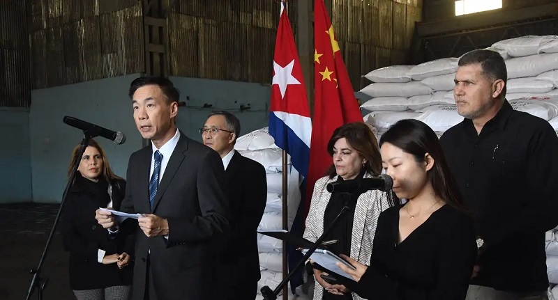 El embajador de China en Cuba, Hua Xin, pronuncia un discurso durante una ceremonia de entrega de ayuda alimentaria en La Habana. Foto Xinhua