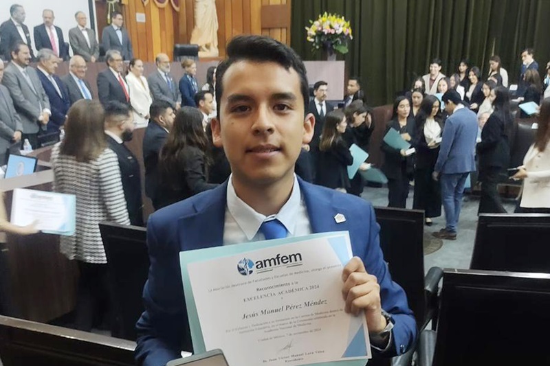 Sin ninguna materia recursada y con un promedio constante de 9.48, Jesús Manuel Pérez Méndez, pasante de la Licenciatura en Medicina General y Comunitaria, del Complejo Regional Nororiental de la BUAP, obtuvo el Premio a la Excelencia Académica 2024 por parte de la Asociación Mexicana de Facultades y Escuelas de Medicina (AMFEM).