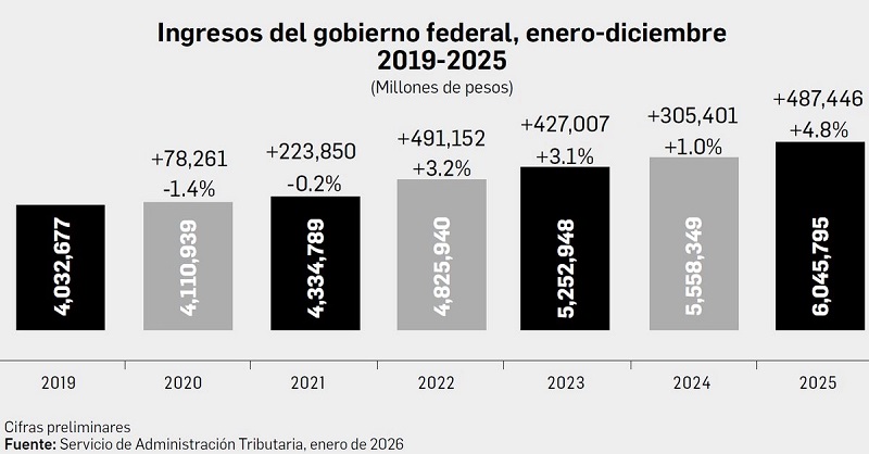 Los ingresos del gobierno federal rompieron un récord en monto, al tiempo que registraron un aumento de 4.8 por ciento en términos reales, respecto a 2024. Es el incremento más alto desde 2017, de acuerdo con la estadísticas de la Secretaría de Hacienda.